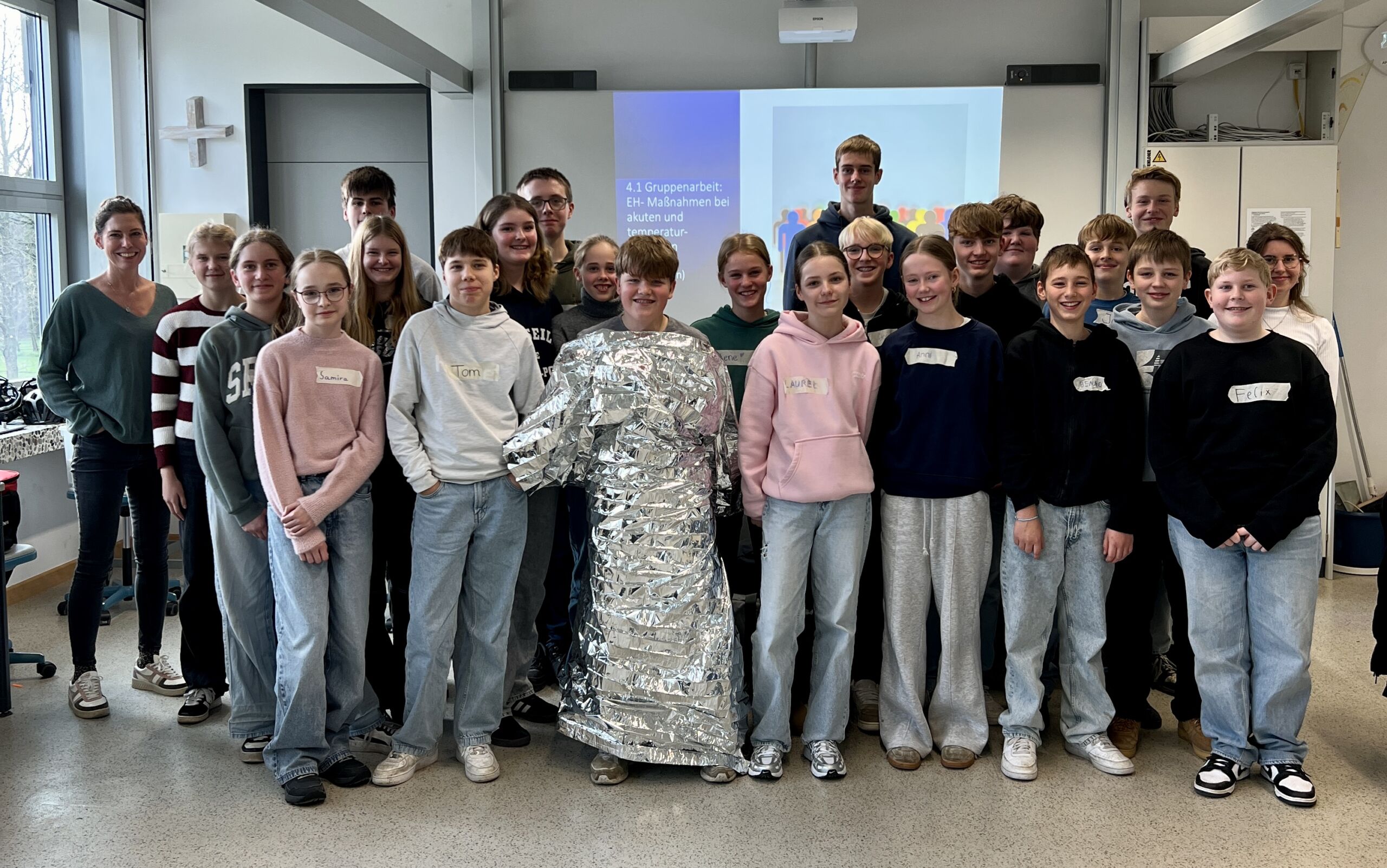 Begleitet wurde die Ausbildungsgruppe von Frau Fleger, die tatkräftige Unterstützung durch bereits erfahrene Schulsanitäter:innen erhielt. So hatten die neuen Mitglieder nicht nur fachliche Anleitung, sondern auch die Gelegenheit, das bestehende Team kennenzulernen und authentische Einblicke in den Alltag der „Senioren“ zu bekommen.