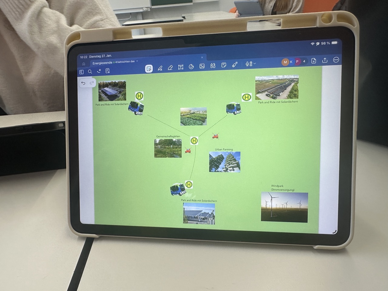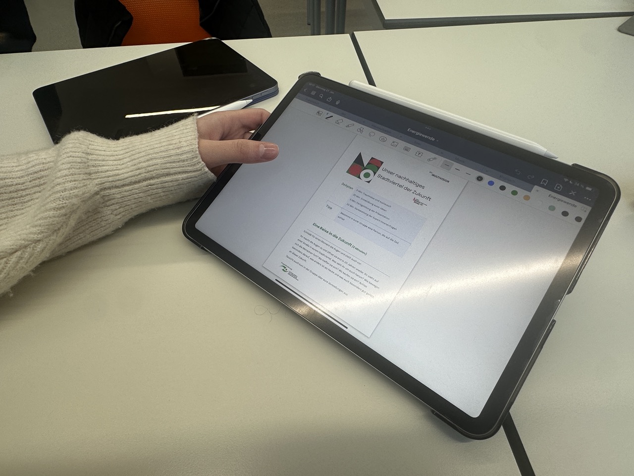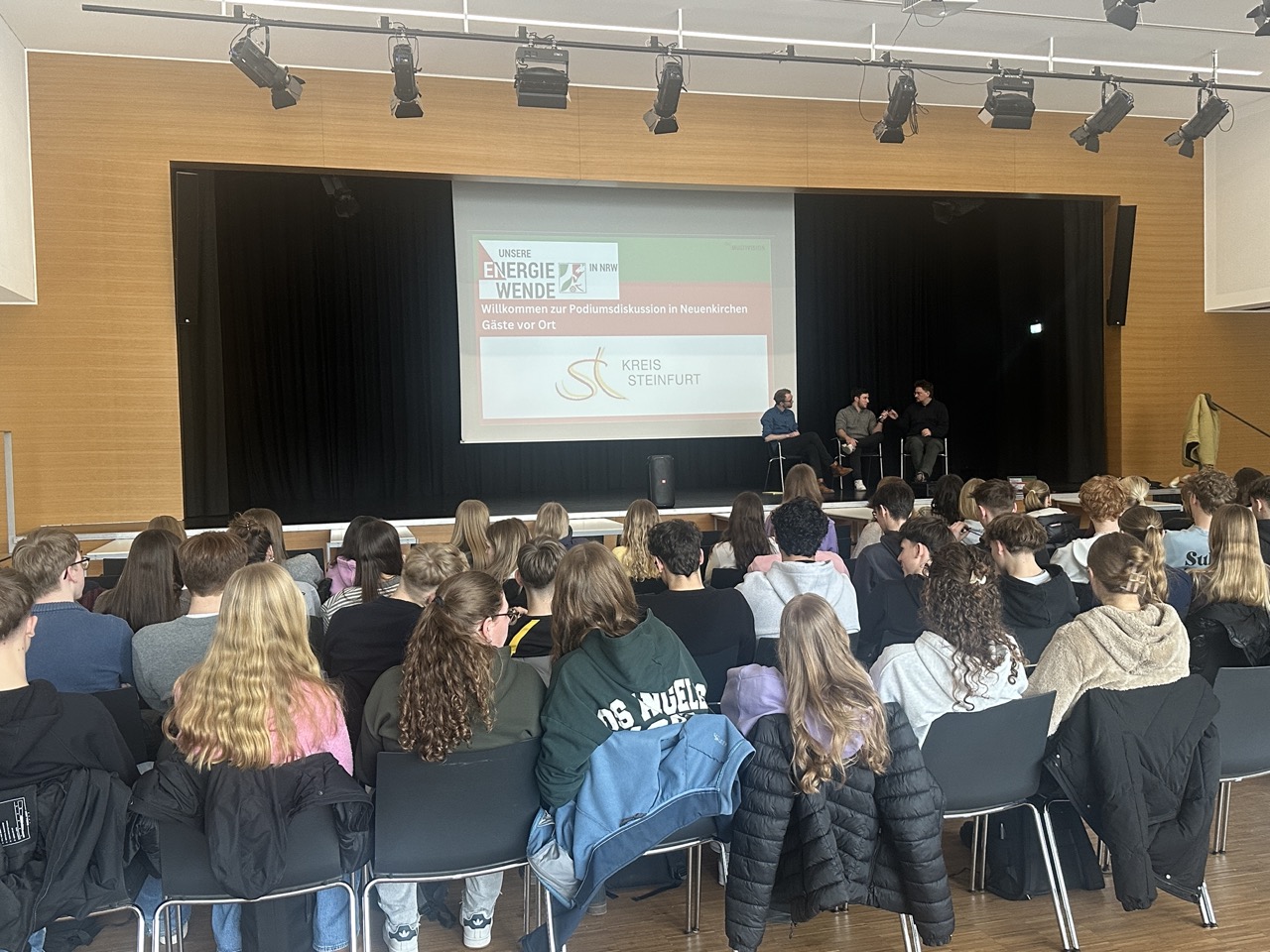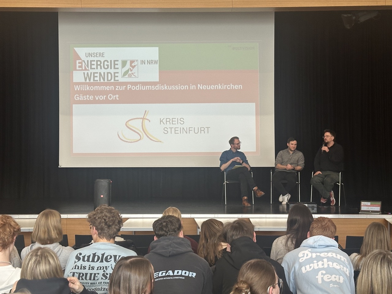 Der Tag startete mit einem gemeinsamen Einstieg in der Aula. In den ersten beiden Stunden vermittelte das Multivision-Team die wichtigsten Grundlagen zur Energiewende und ordnete zentrale Begriffe und Zusammenhänge ein. Videoimpulse machten das Thema anschaulich und lenkten den Blick auf NRW und die kommunale Ebene. Anschließend ging es in Workshops weiter: In Gruppen diskutierten die Schülerinnen und Schüler Beispiele, tauschten Perspektiven aus und entwickelten Ideen dazu, was Energiewende in der Praxis bedeuten kann. Zum Abschluss kam die gesamte Stufe wieder in der Aula zusammen, wo in der fünften und sechsten Stunde eine Podiumsdiskussion mit Gästen wie Jens Leopold als Solarspezialist des Kreises Steinfurt stattfand.