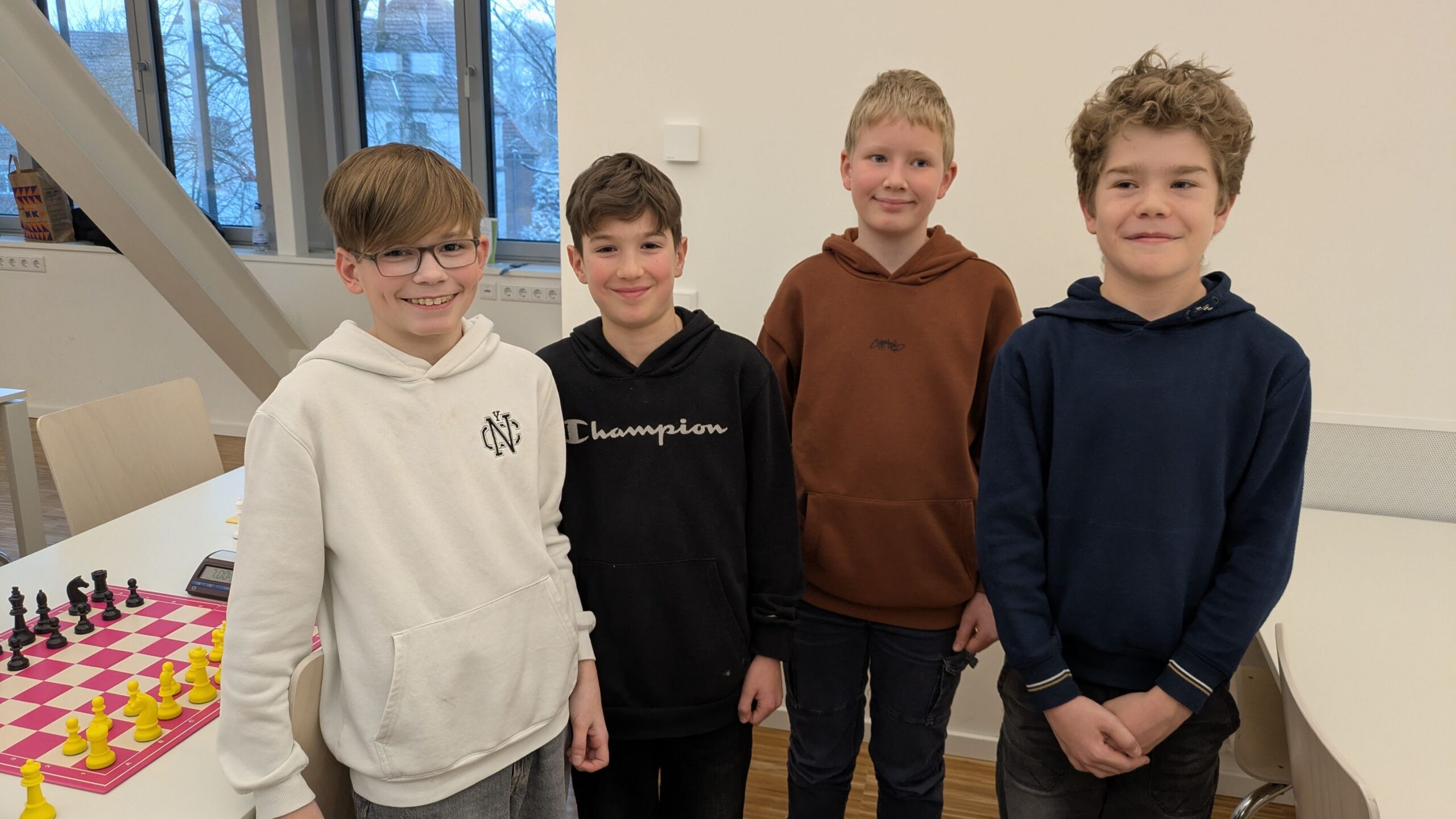 Die neu gegründete Mannschaft besteht aus vier Schülern (Jannis Cremann, Leo Pieper, Felix Bernemann und Liam Bădără), die ihre Begeisterung für das königliche Spiel vereint hat. Was zunächst als gemeinsames Hobby begann, entwickelte sich rasch zu einem Teamgeist, der nun auch über die Schule hinaus sichtbar geworden ist. Bereits am Tag der Gründung stellte sich die Mannschaft einer sportlichen Bewährungsprobe: Am 28. Januar 2026 nahm sie an der Schach-Kreismeisterschaft der Schulen im Kreis Steinfurt teil, die in diesem Jahr am Gymnasium Dionysianum in Rheine ausgetragen wurde.