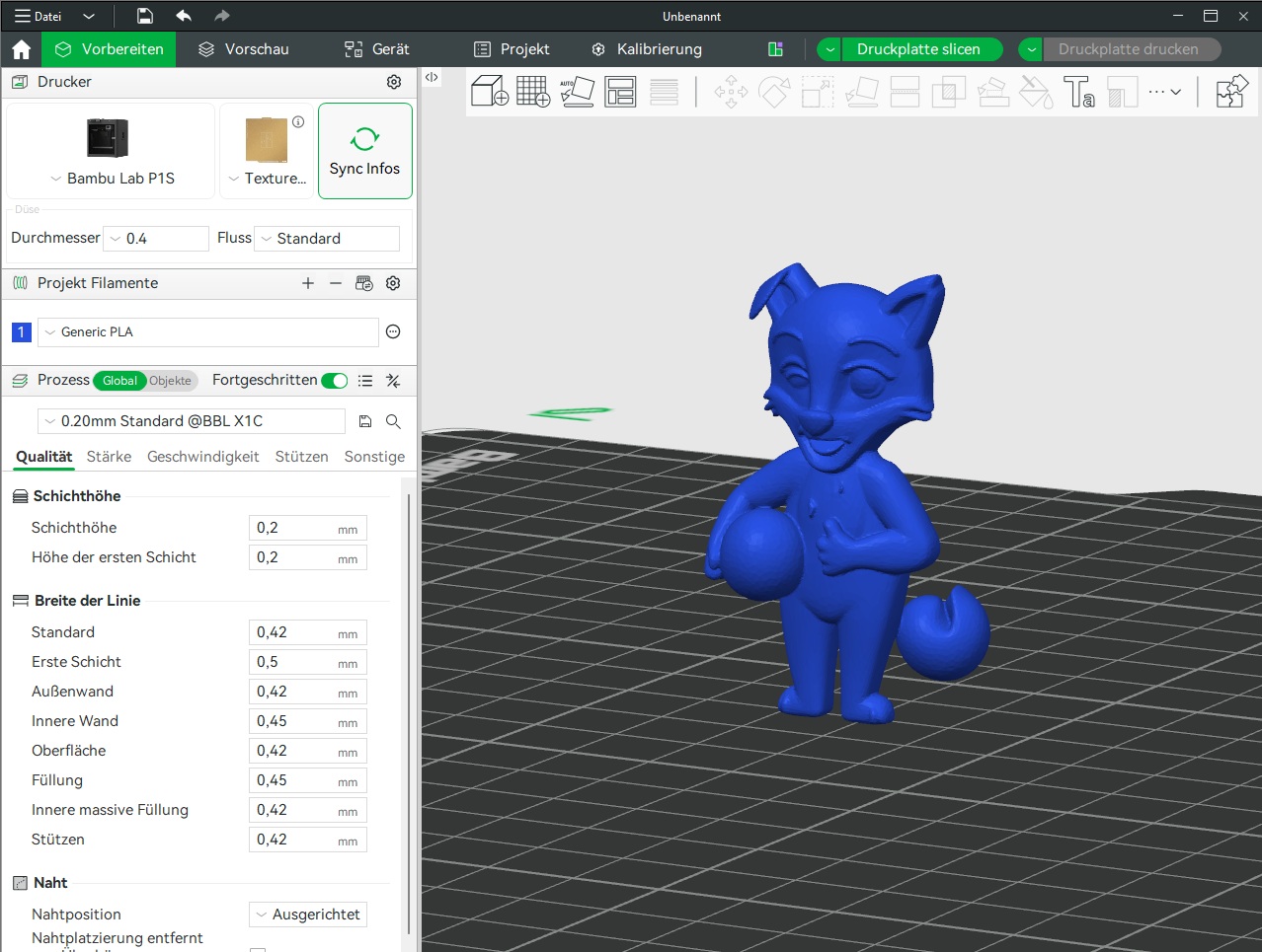 Bei dem angeschafften Gerät handelt es sich um das Modell „P1S Combo“ des Herstellers Bambu Lab. Ausschlaggebend für die Auswahl waren insbesondere die einfache Bedienung, die hohe Druckqualität sowie die Robustheit des Geräts. Gerade im Schulalltag sind eine geringe Wartungsanfälligkeit und eine zuverlässige Technik entscheidend. Das Modell stellt dabei einen gelungenen Kompromiss zwischen hoher Qualität und einem möglichst niedrigen Anschaffungspreis dar.
