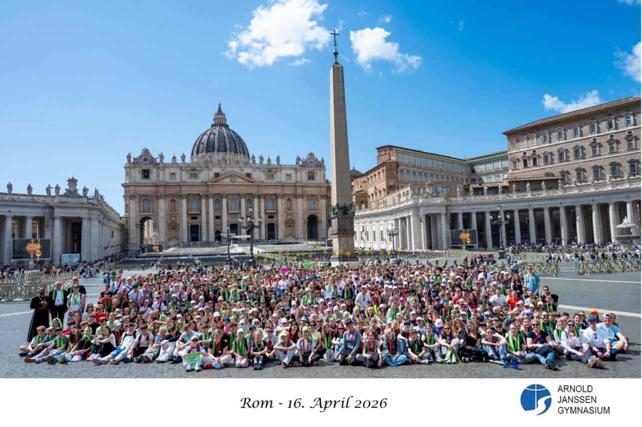 Es war eine Jahrhundertreise, die so schnell vermutlich nicht noch einmal passieren wird. Die gesamte Schulgemeinde des Arnold-Janssen-Gymnasiums (AJG) war im Rahmen des 100-jährigen Jubiläums in Rom. Über 1.000 Teilnehmerinnen und Teilnehmer, darunter Schülerinnen, Schüler, Lehrkräfte, Eltern und ein Ärzte-Team waren in der italienischen Hauptstadt. Am Montag kamen sie wieder zurück nach St. Arnold und haben viele Eindrücke und Erlebnisse sammeln können, wie einige Schülerinnen und Schüler berichten. Und auch das Gemeinschaftsgefühl unter ihnen wurde in dieser Zeit gestärkt.