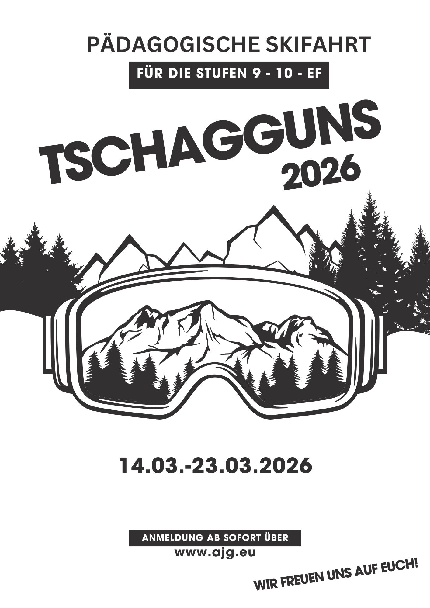Wir halten an der Tradition fest. Die pädagogische Skifahrt “Tschagguns 2026” ist geplant und die Anmeldungen können jetzt kommen. Bis zum Dienstag, den 07. Oktober (23:59 Uhr) haben die Schülerinnen und Schüler der Jahrgangsstufen 9, 10 und EF die Möglichkeit, sich für die pädagogische Skifahrt in Österreich zu bewerben. Anders als in den letzten Jahren findet die Fahrt jedoch nicht in den Osterferien, sondern bereits vom 14.03.2026 (Samstag) bis 23.03.2026 (Montag) statt. Bewirb dich um einen Platz, indem du dich über das Formular hier anmeldest. Dies wird am Mittwoch (24.09.2025, ab 06:30 Uhr) aktiv geschaltet.