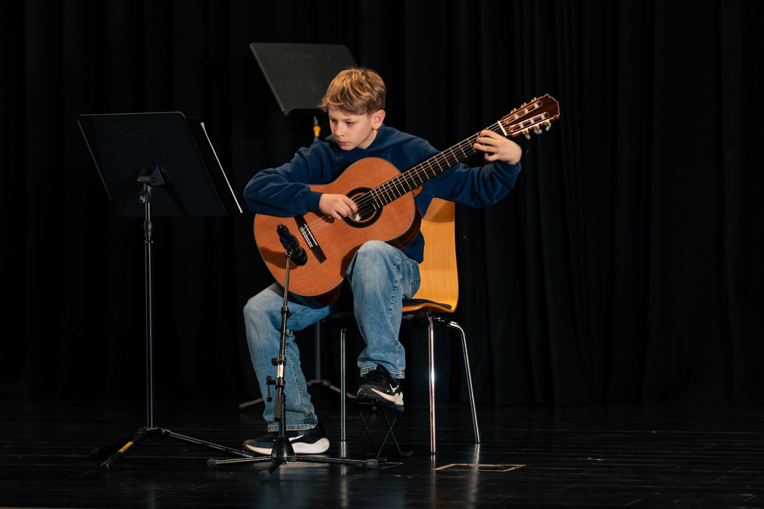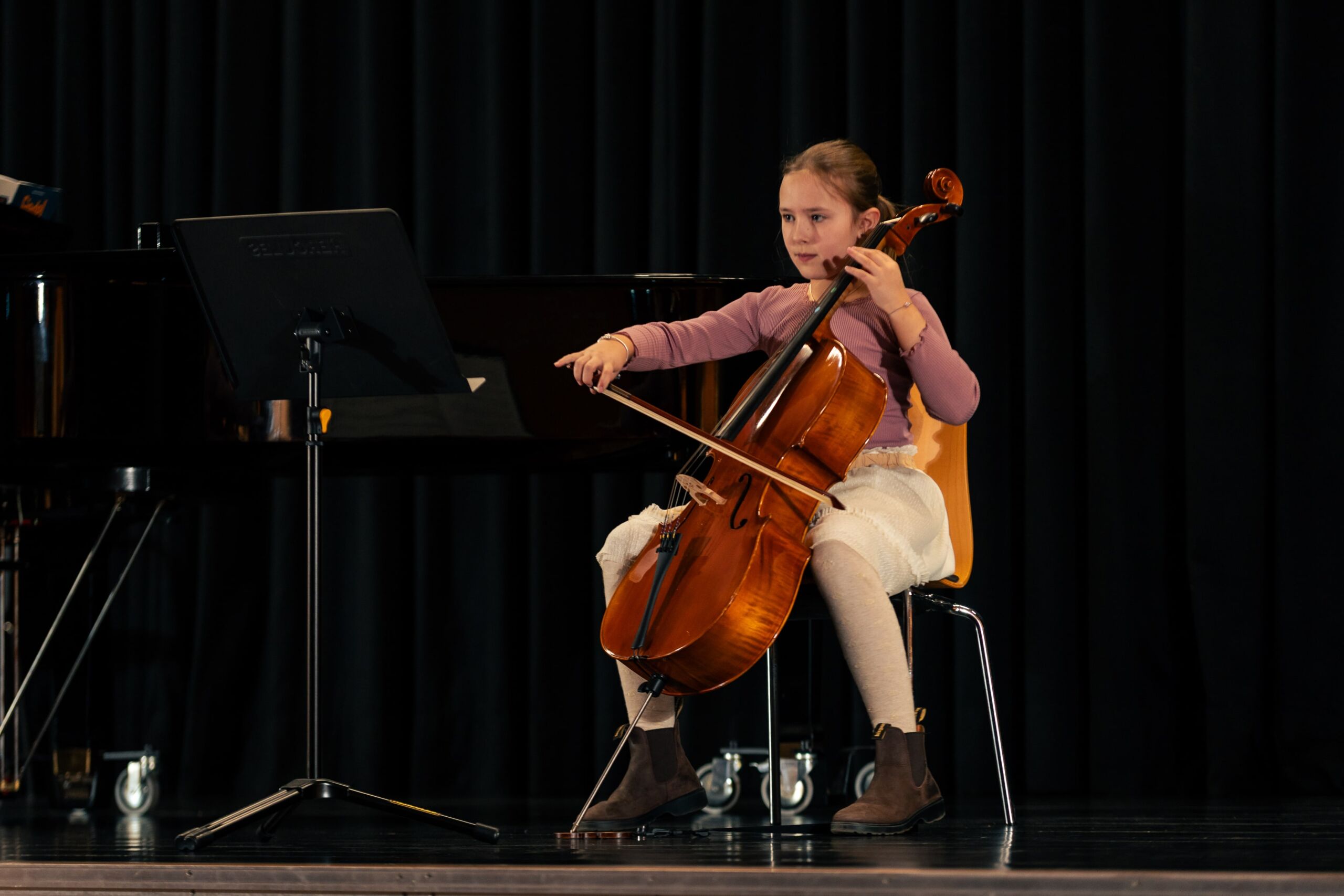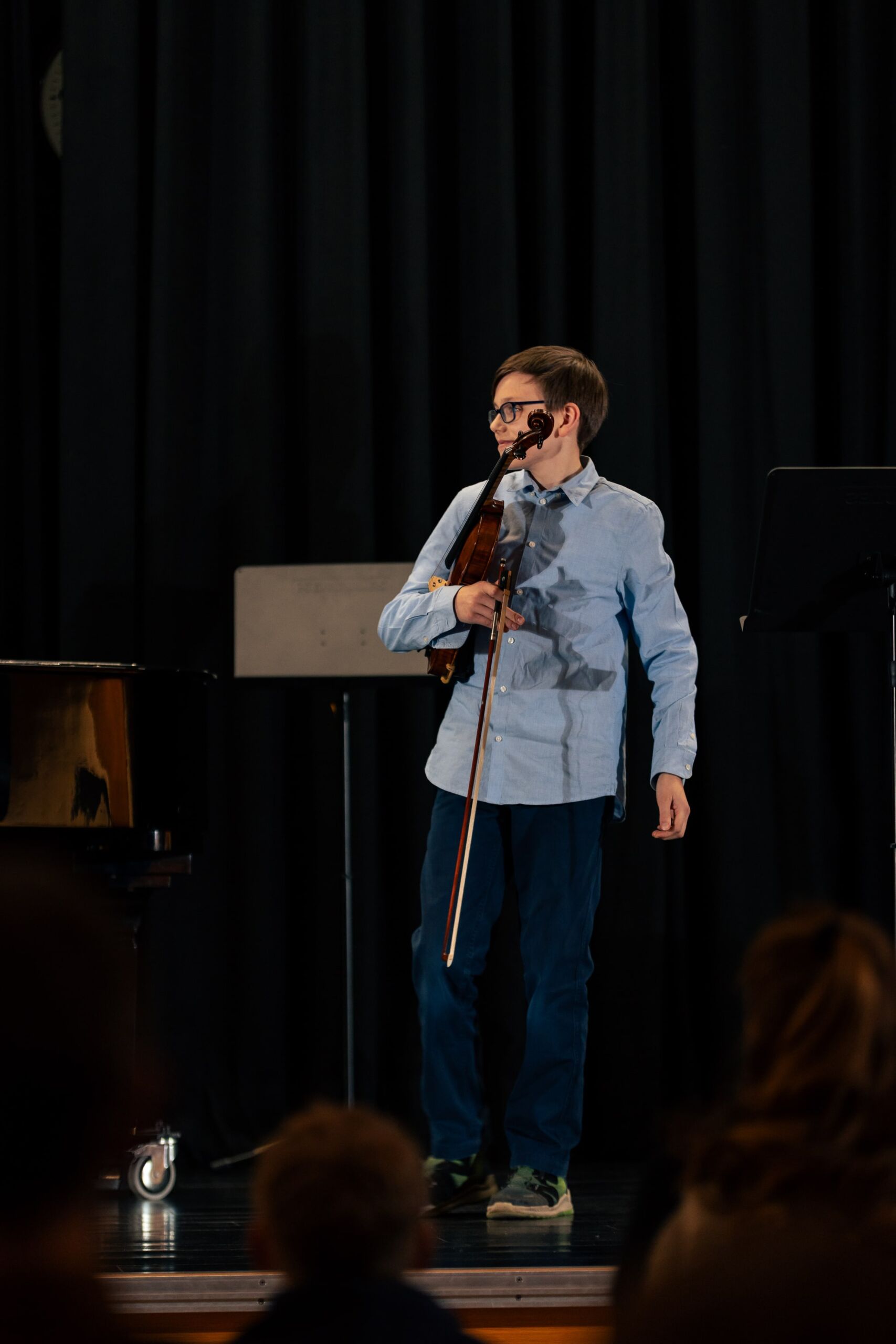 .Den Anfang machten zwei Schülerinnen der Jahrgangstufe 5, die an diesem Abend ihre persönliche Premiere am AJG hatten: Frieda Heuring (5c) spielte sicher und mit schönem Klang eine Mazurka von Holzer-Romberg auf dem Cello und Sofia Basenko (5a) präsentierte auf der Geige gekonnt den bekannten Jazzwalzer von Schostakowitsch. Marlin Ahlers (6d) trug mit viel Spielfreude eine Sonatine von Clementi auf dem Klavier vor, gefolgt von Moritz Weber (6a), der auf seiner Gitarre das Stück Classical Mood von Szordikowski konzentriert und gefühlvoll darbot. Im Anschluss spielte Justus Bartels (7c) mit viel Gestaltung in Dynamik und Tempo einen Walzer von Chopin für Klavier.