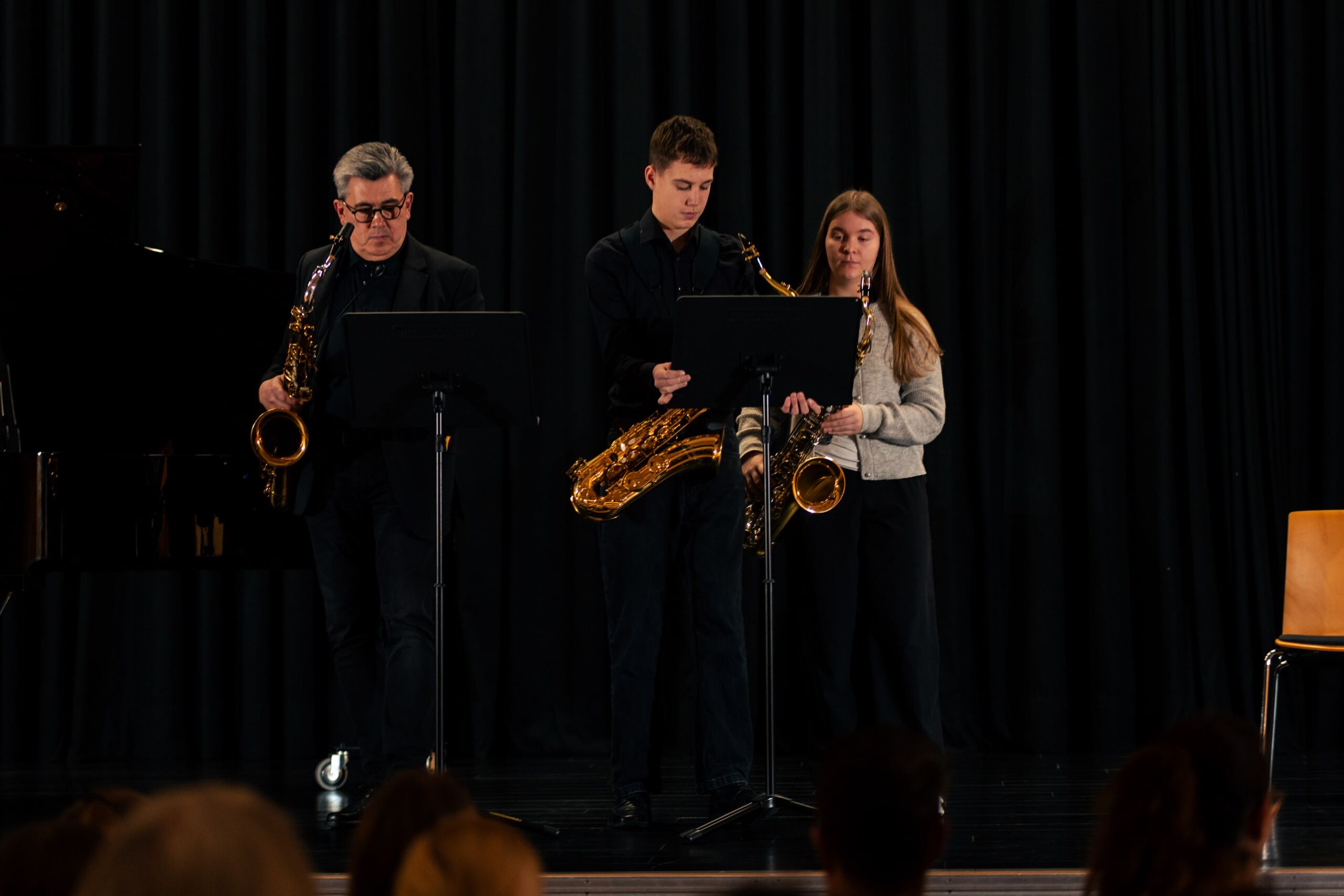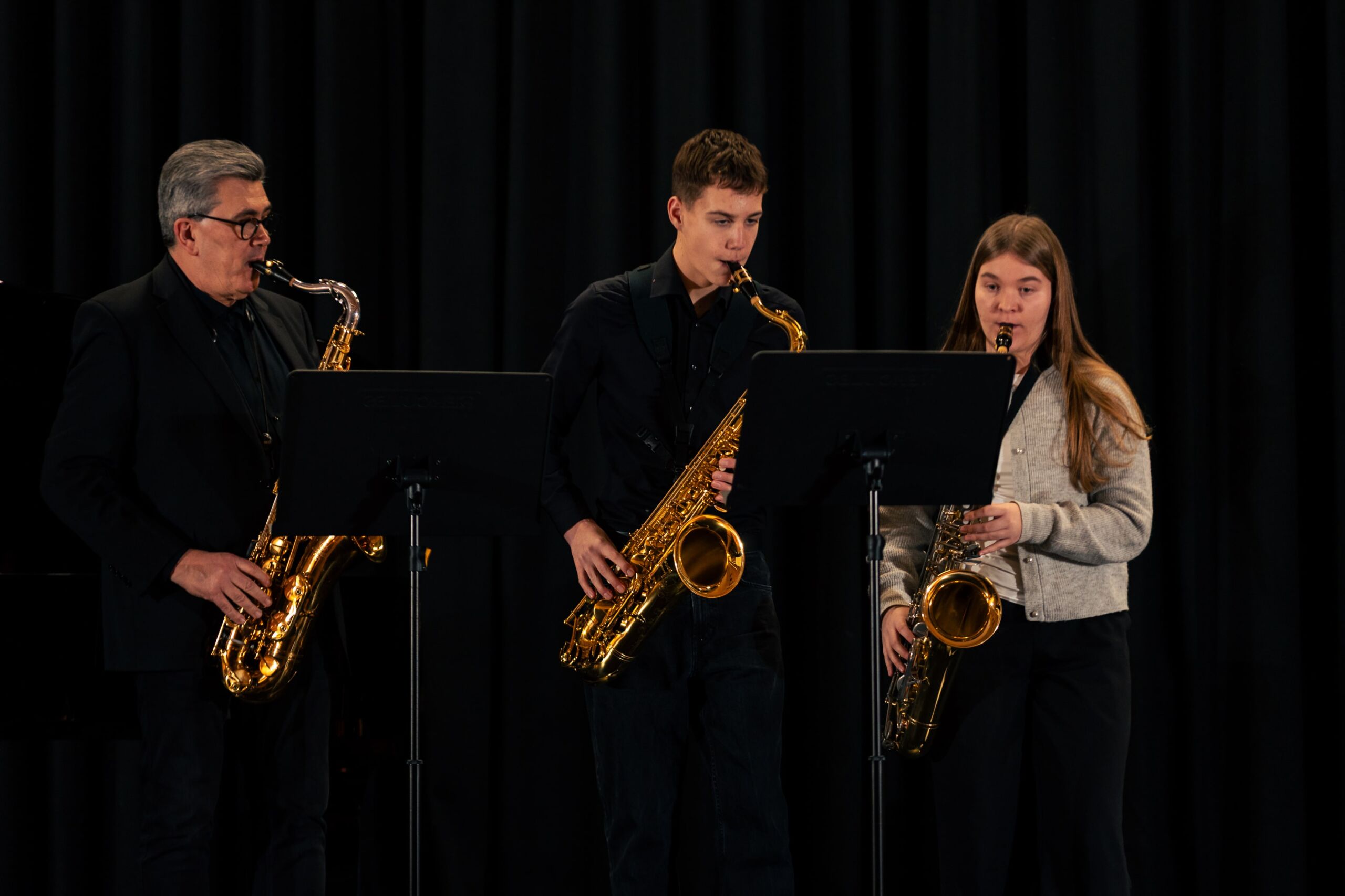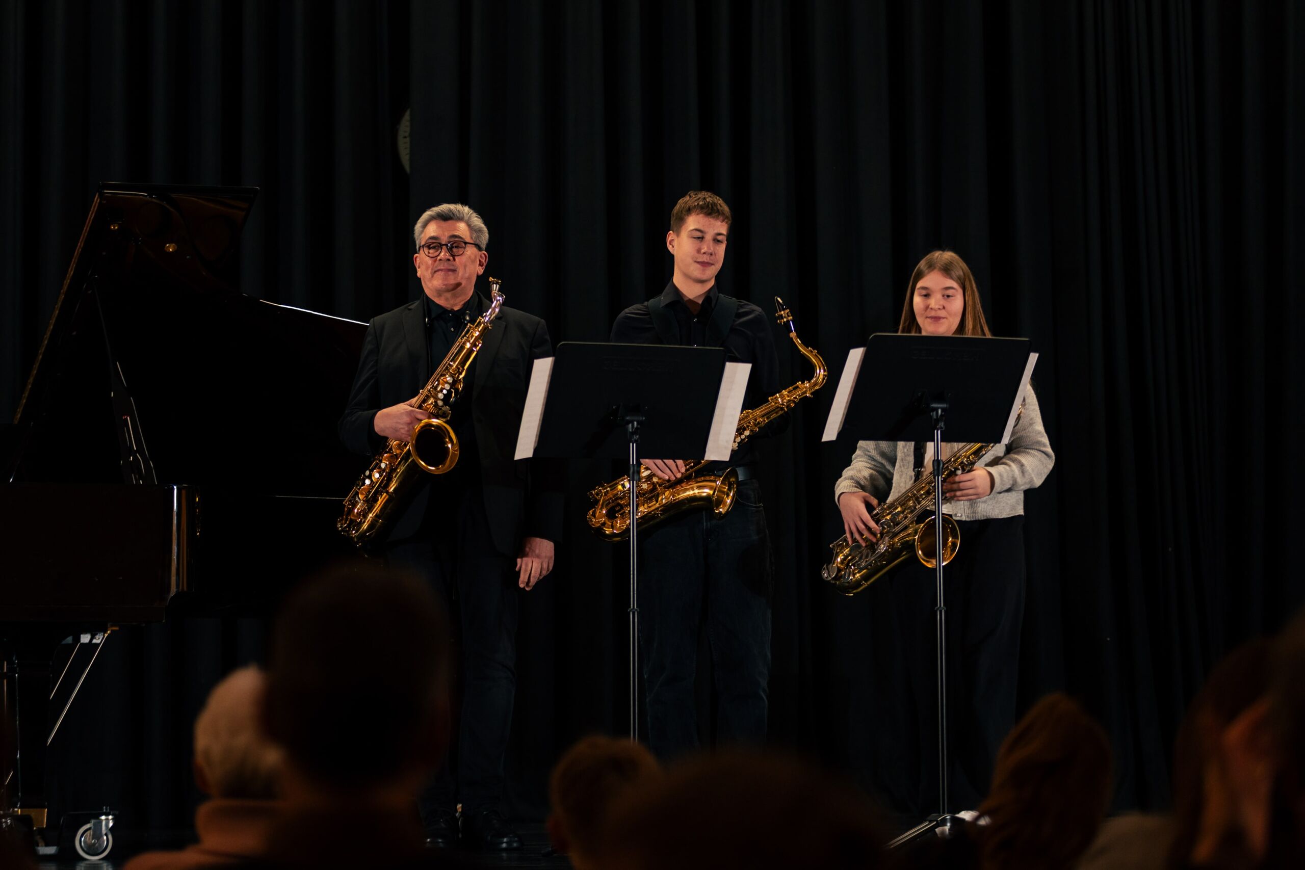 Bereichert wurde das überwiegend klassische Programm durch drei bekannte Themen aus Film und Musical: Das bestens aufeinander abgestimmte Saxophontrio aus Maja Stall (9c), Johann Lüning (9a) und ihrem Lehrer Lothar Eirmbter präsentierte mit Schwung John Williams Imperial March und bewies Feingefühl und einen sanften Klang bei Hedwigs Theme sowie Harold Arlens Somewhere over the rainbow.