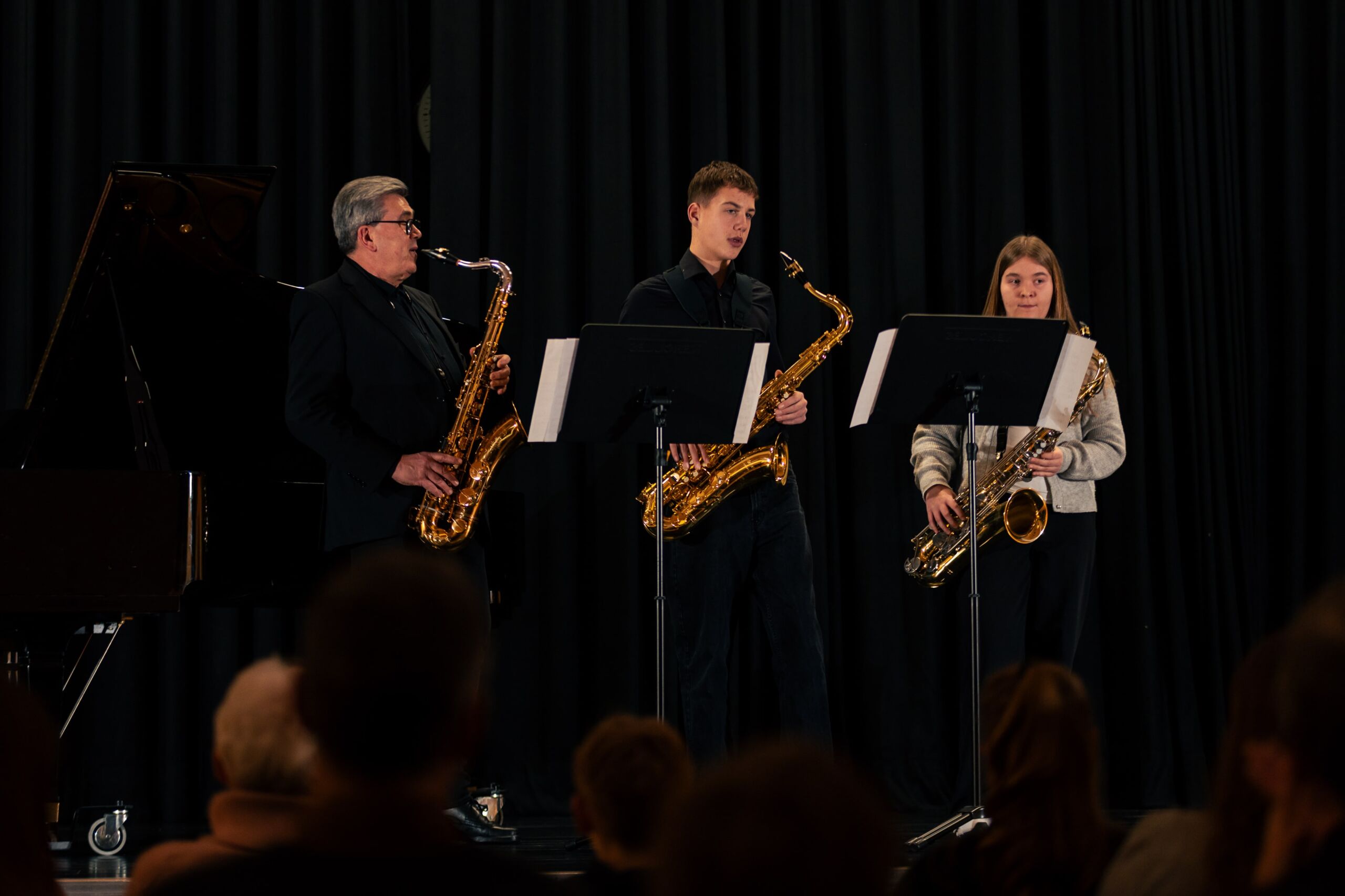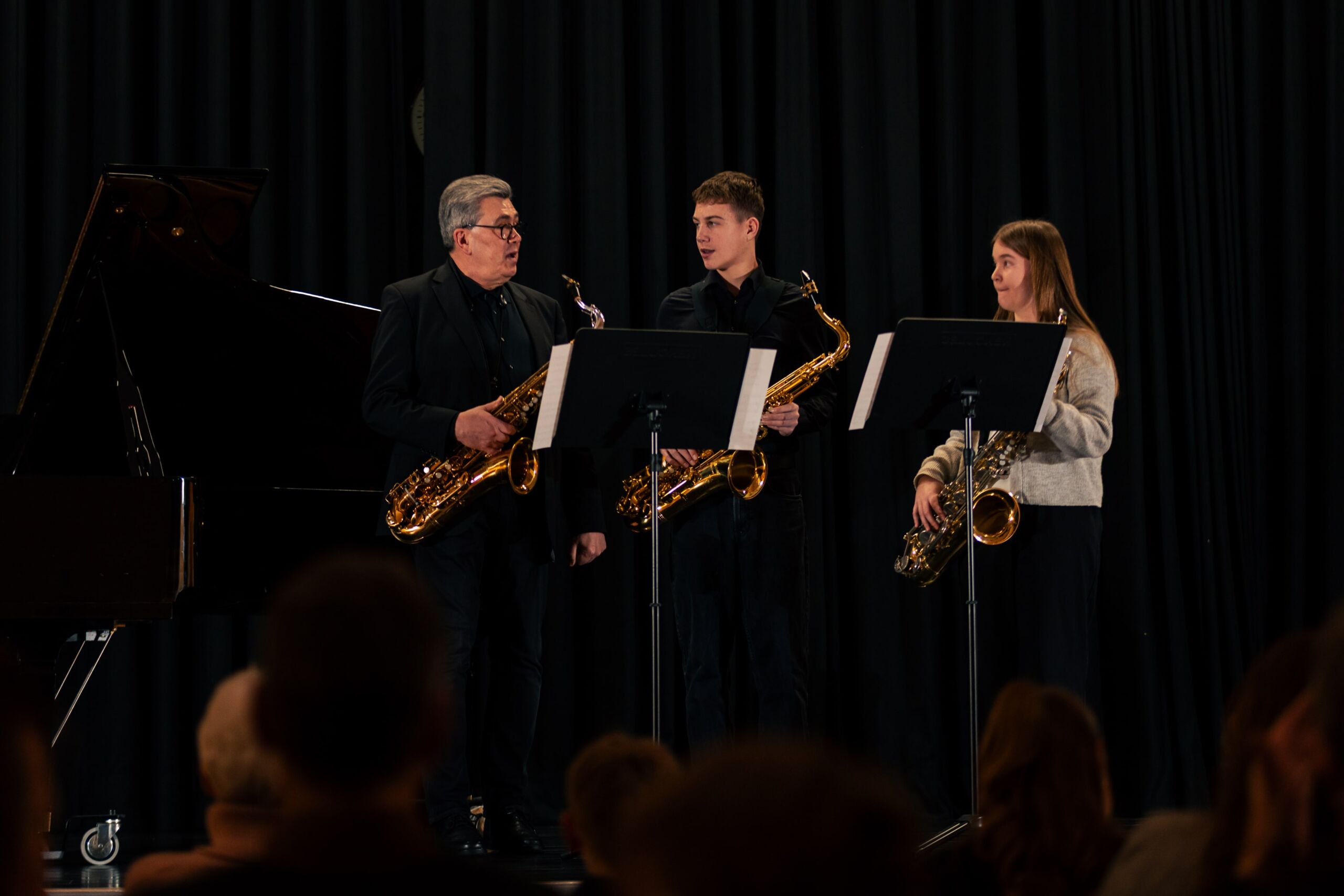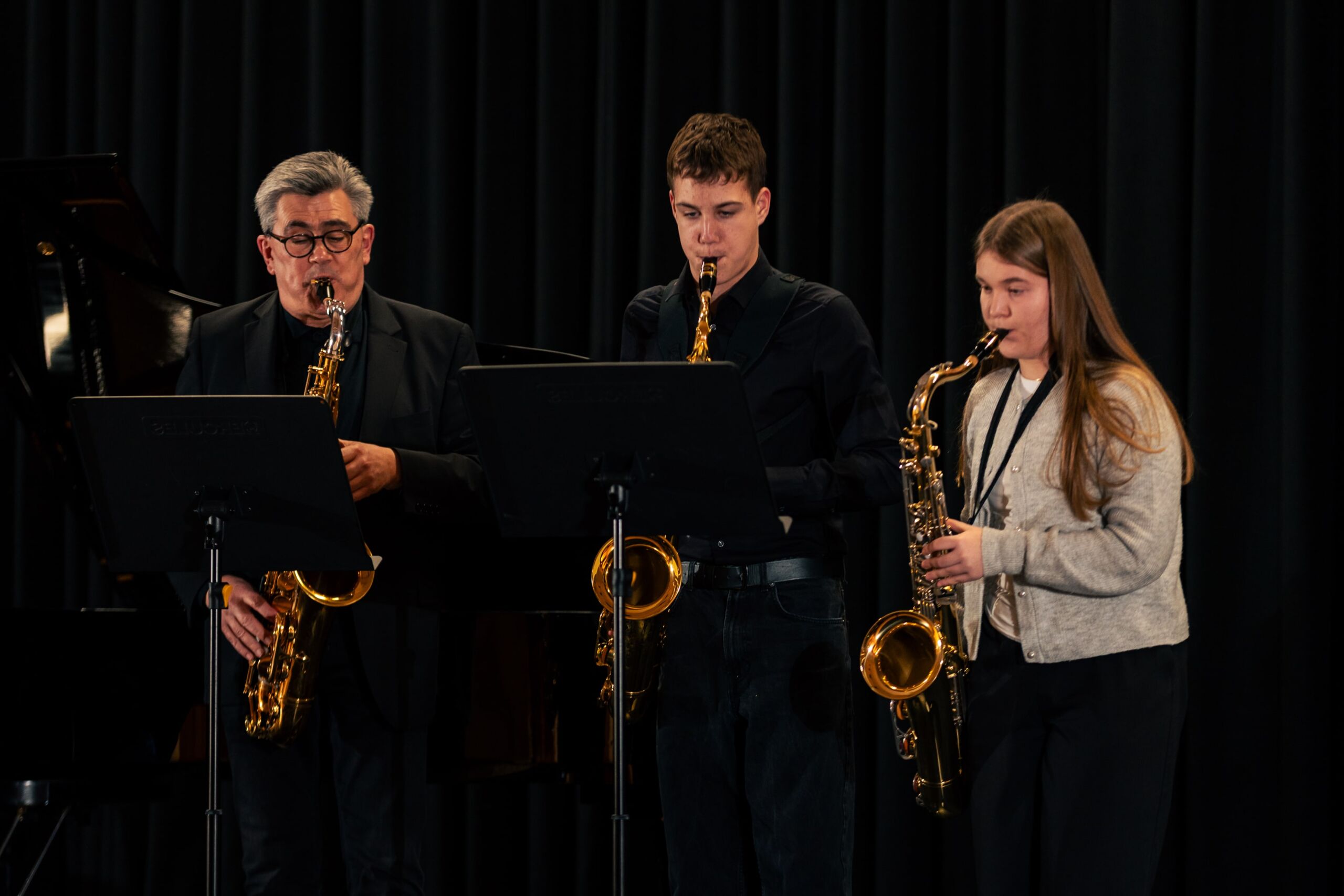 Bereichert wurde das überwiegend klassische Programm durch drei bekannte Themen aus Film und Musical: Das bestens aufeinander abgestimmte Saxophontrio aus Maja Stall (9c), Johann Lüning (9a) und ihrem Lehrer Lothar Eirmbter präsentierte mit Schwung John Williams Imperial March und bewies Feingefühl und einen sanften Klang bei Hedwigs Theme sowie Harold Arlens Somewhere over the rainbow.