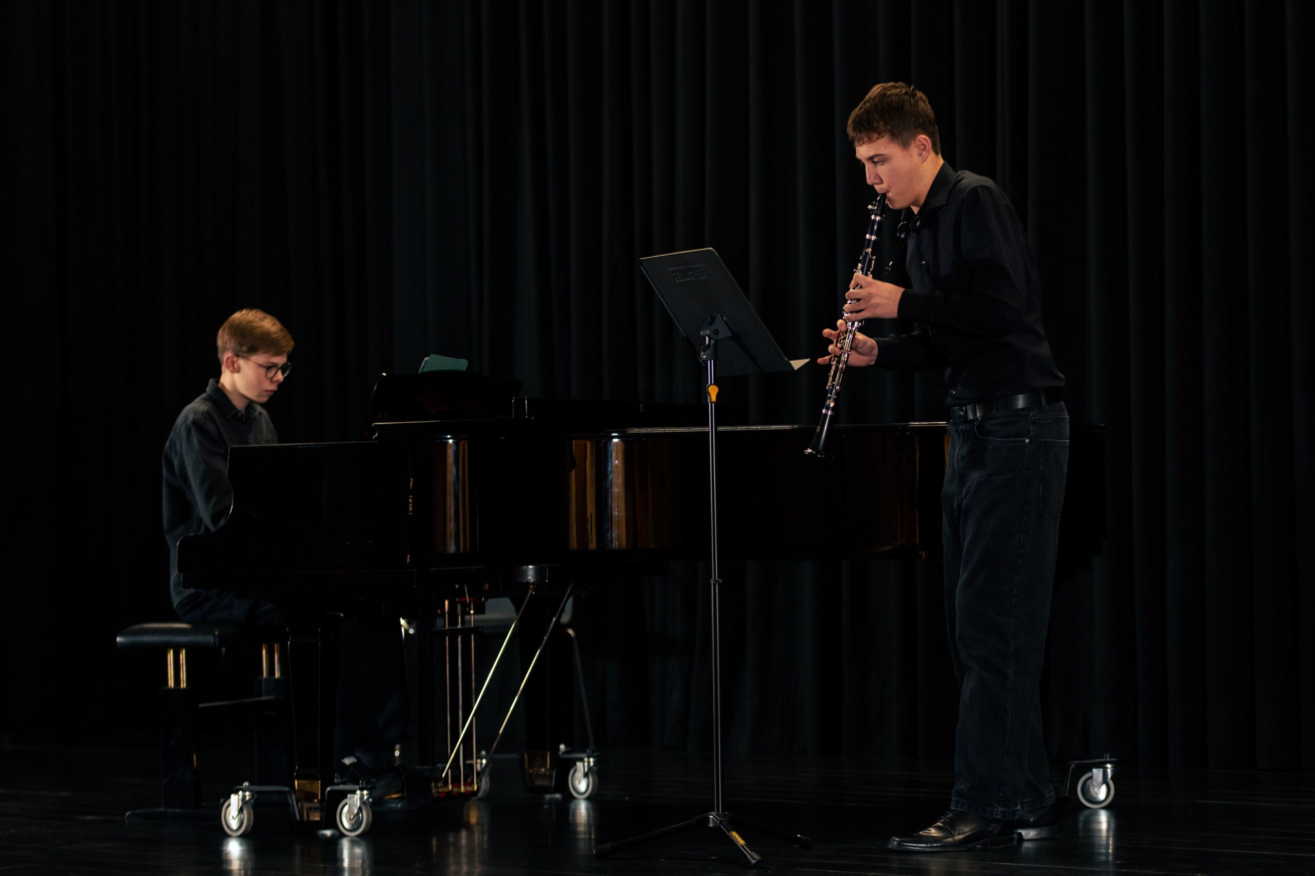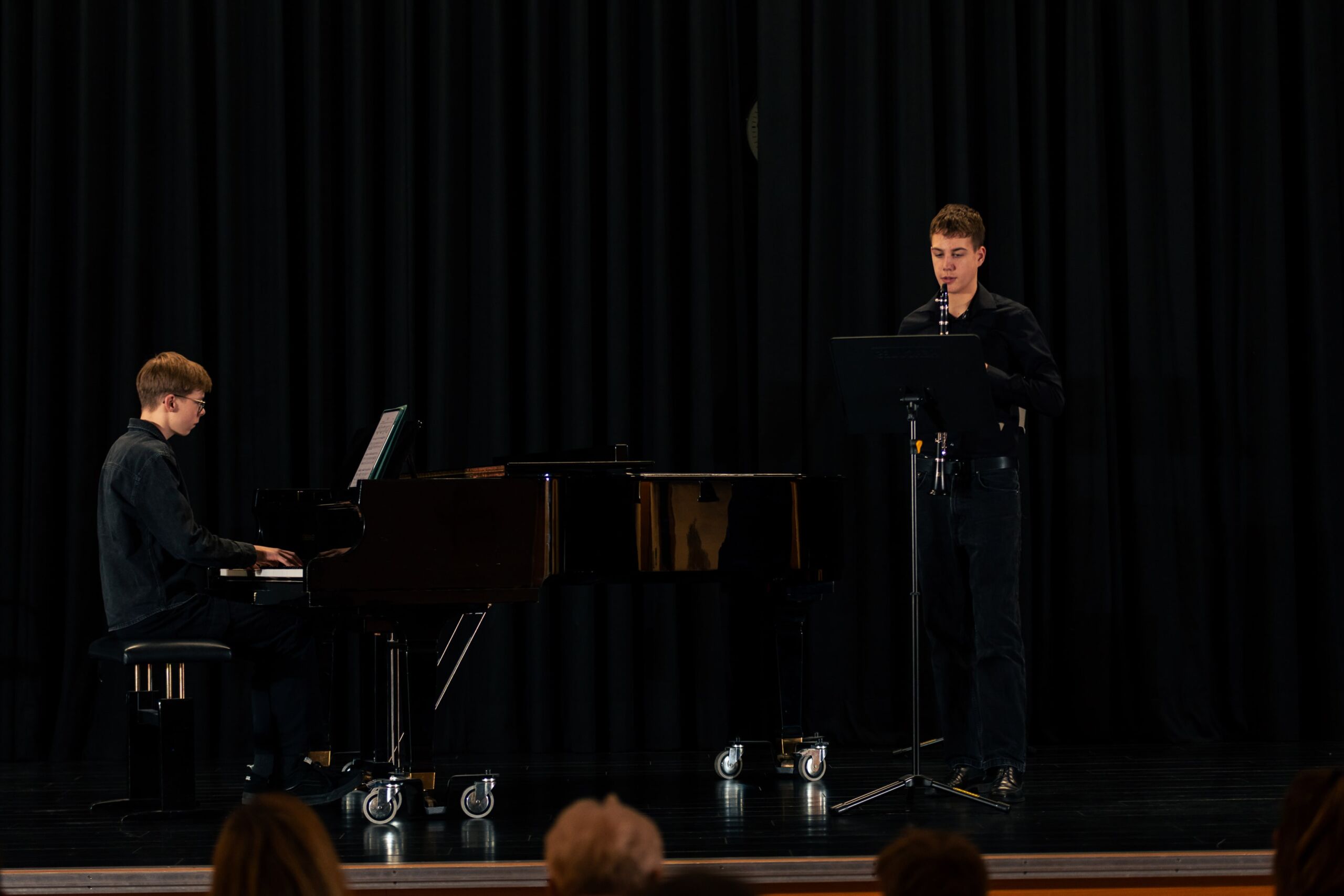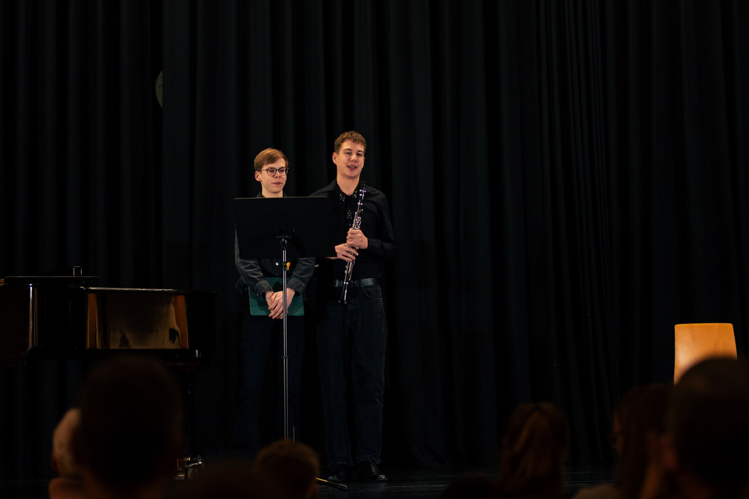 Die letzten drei Werke stammten alle aus dem späten 19. Jahrhundert und zeigten dem Publikum, wie meisterhaft schon junge Interpreten sein können: Bei Bärmanns Romanze und Nielsens Fantasie verzauberte Johann Lünen das Publikum mit seinem ausdrucksstarken Spiel, während Julius Foullois (9c) ihn gekonnt, dezent und virtuos am Klavier begleitete.