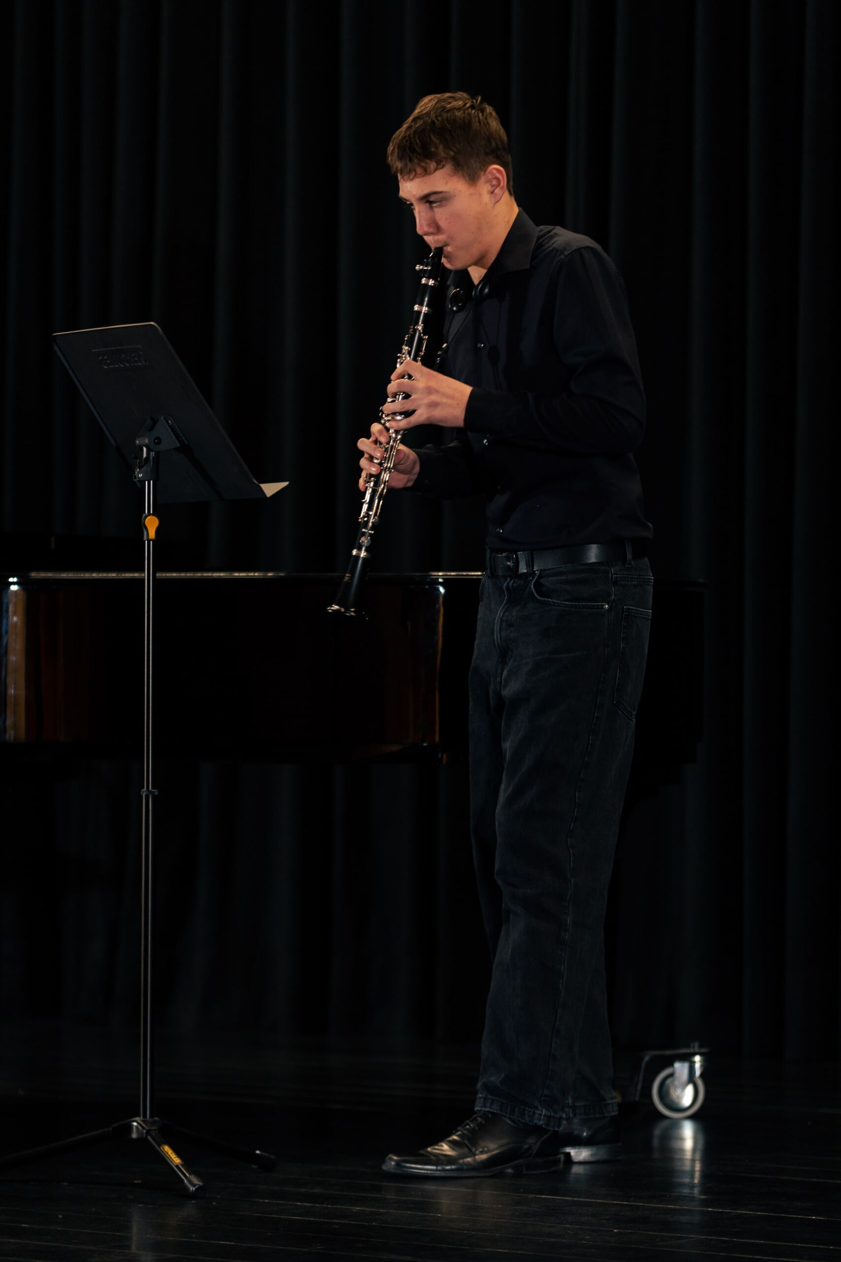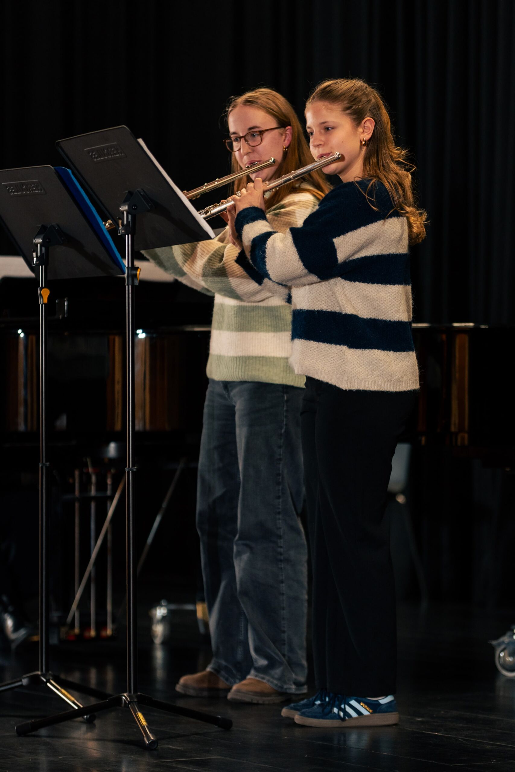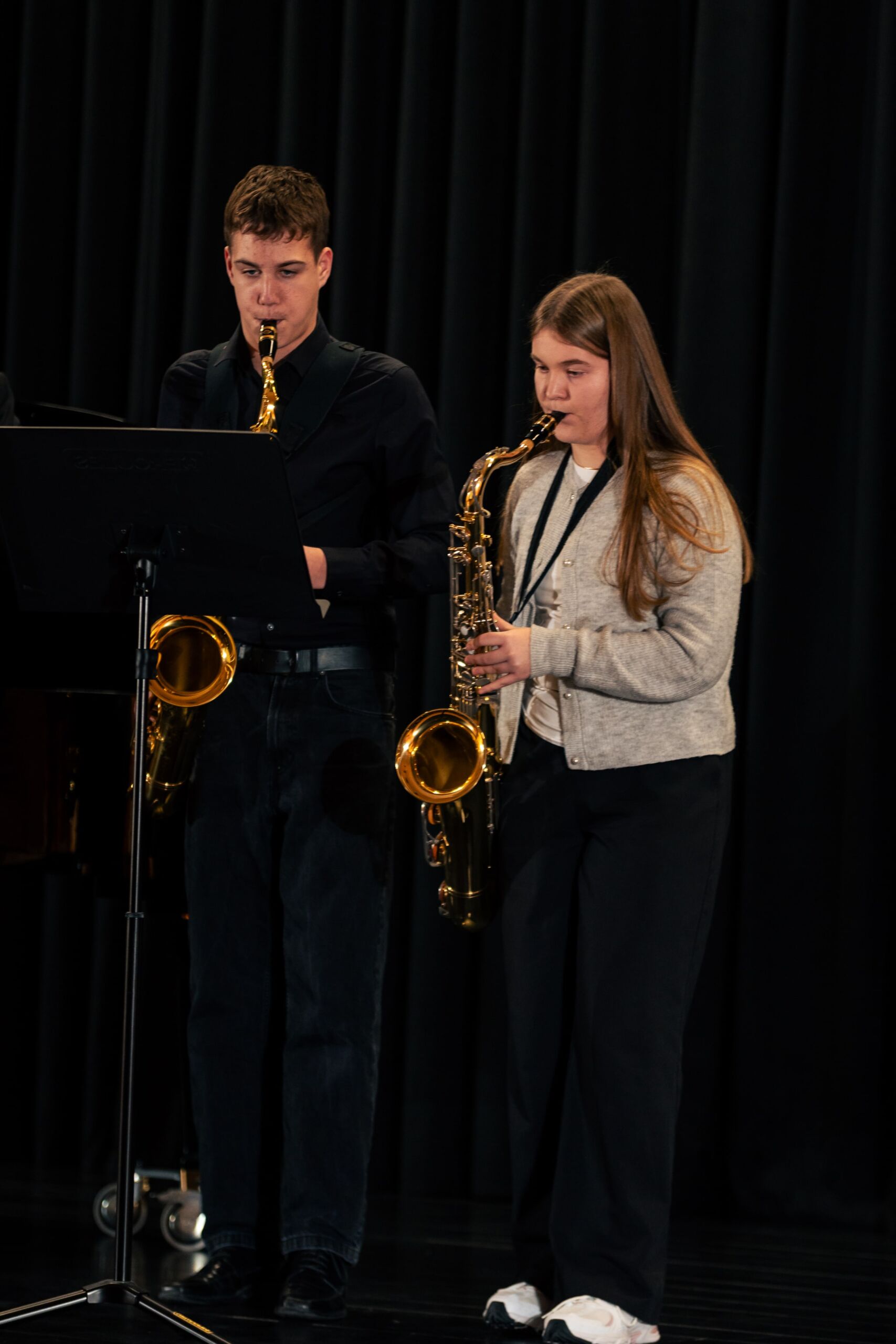 Die letzten drei Werke stammten alle aus dem späten 19. Jahrhundert und zeigten dem Publikum, wie meisterhaft schon junge Interpreten sein können: Bei Bärmanns Romanze und Nielsens Fantasie verzauberte Johann Lünen das Publikum mit seinem ausdrucksstarken Spiel, während Julius Foullois (9c) ihn gekonnt, dezent und virtuos am Klavier begleitete.