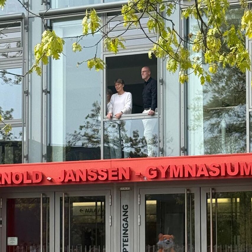 Mit einer perfekt geplanten Geheimaktion haben das Kollegium und die Elternvertreter:innen des Arnold-Janssen-Gymnasiums am Montag bei der Schulleitung für staunende Gesichter gesorgt. Hintergrund war der Wunsch der Schulgemeinde, noch einmal bewusst Danke zu sagen – etwas, was bei der Rückkehr nach 20-stündiger Rückreise von der Romfahrt (13.–20.04.) unter dem Motto „AJGemeinsam – Wurzeln suchen – Schätze finden“ etwas untergegangen war.